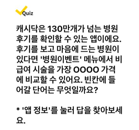 캐시닥은 130만개가 넘는 병원 후기를 확인할 수 있는 앱이에요. 후기를 보고 마음에 드는 병원이 있다면 '병원이벤트' 메뉴에서 비급여 시술을 가장 OOOO 가격에 비교할 수 있어요. 빈칸에 들어갈 단어는 무엇일까요?