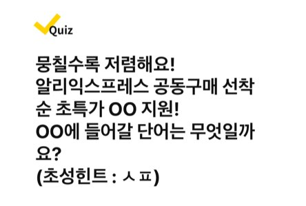 뭉칠수록 저렴해요! 알리익스프레스 공동구매 선착순 초특가 OO지원! OO에 들어갈 단어는 무엇일까요? (초성힌트 : ㅅㅍ)