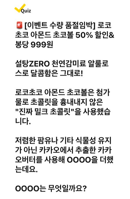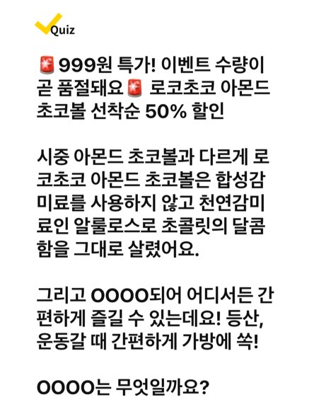 ✅ 🚨999원 특가!이벤트 수량이 곧 품절돼요🚨 로코초코 아몬드 초코볼 선착순 50% 할인 시중 아몬드 초코볼과 다르게 로코초코 아몬드 초코볼은 합성감미료를 사용하지 않고 천연감미료인 알룰로스로 초콜릿의 달콤함을 그대로 살렸어요. 그리고 OOOO되어 어디서든 간편하게 즐길 수 있는데요! 등산, 운동갈 때 간편하게 가방에 쏙! OOOO는 무엇일까요?