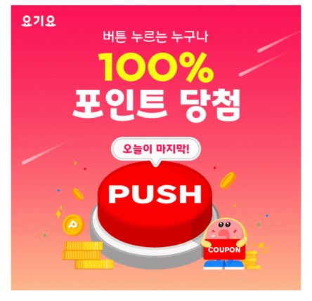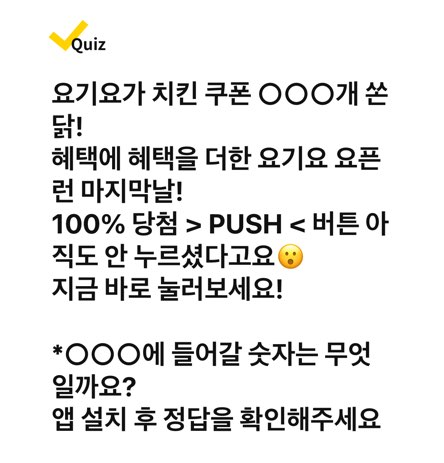 ✅ 요기요가 치킨 쿠폰 OOO개 쏜닭! 혜택에 혜택을 더한 요기요 요픈런 마지막날! 100% 당첨 >PUSH< 버튼 아직도 안 누르셨다고요 😯 지금 바로 눌러보세요! *OOO에 들어갈 숫자는 무엇일까요?