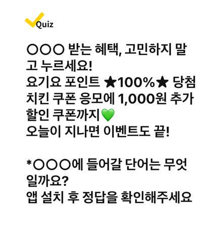 ✅ OOO 받는 혜택, 고민하지 말고 누르세요! 요기요 포인트 ★100%★ 당첨 치킨 쿠폰 응모에 1,000원 추가 할인 쿠폰까지💚 오늘이 지나면 이벤트도 끝! *OOO에 들어갈 단어는 무엇일까요?