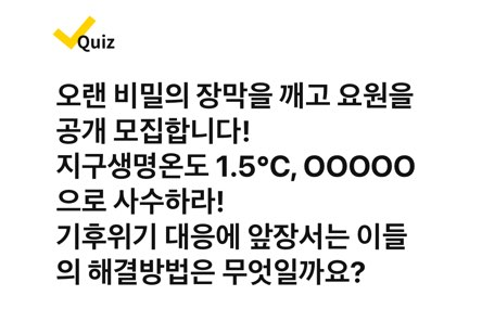 ✅ 오랜 비밀의 장막을 깨고 요원을 공개 모집합니다! 지구생명온도 1.5˚C, OOOOO으로 사수하라! 기후위기 대응에 앞장서는 이들의 해결방법은 무엇일까요?