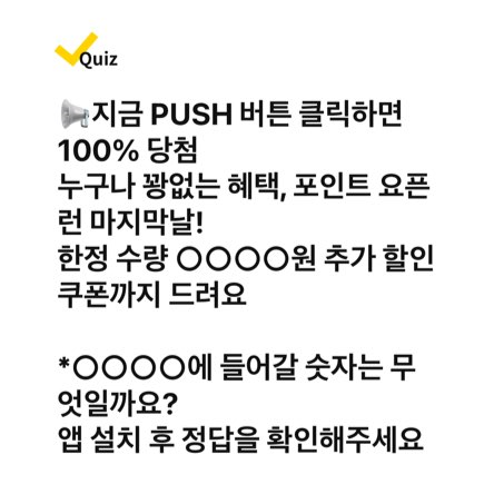 ✅ 지금 PUSH 버튼 클릭하면 100% 당첨 누구나 꽝없는 혜택, 포인트 요픈런 마지막날! 한정수량 OOOO원 추가 할인 쿠폰까지 드려요. *OOOO에 들어갈 숫자는 무엇일까요?
