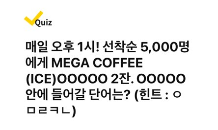 ✅ 매일 오후 1시! 선착순 5,000명에게 MEGA COFFEE (ICE)OOOOO 2잔. OOOOO 안에 들어갈 단어는? (힌트 : ㅇㅁㄹㅋㄴ)