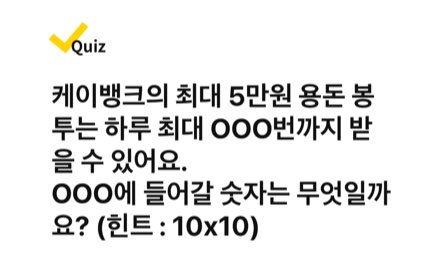 ✅ 케이뱅크의 최대 5만원 용돈봉투는 하루 최대 OOO번까지 받을 수 있어요. OOO에 들어갈 숫자는 무엇일까요? (힌트 : 10X10)
