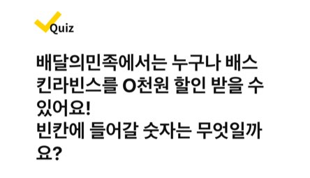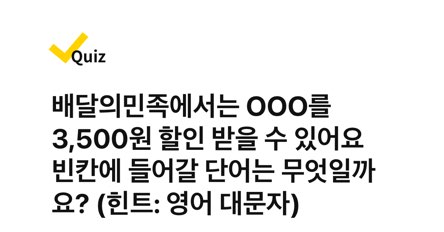 ✅ 배달의민족에서는 OOO을 3,500원 할인 받을 수 있어요 빈칸에 들어갈 단어는 무엇일까요? (힌트: 영어 대문자)