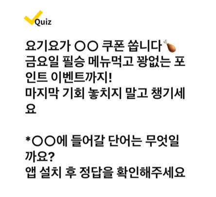 ✅ 요기요가 OO 쿠폰 쏩니다🍗 금요일 필승 메뉴 먹고 꽝없는 포인트 이벤트까지! 마지막 기회 놓치지 말고 챙기세요. *OO에 들어갈 단어는 무엇일까요?