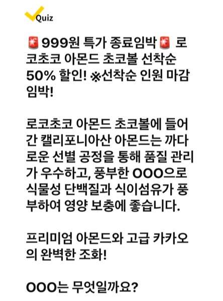 ✅ 🚨999원 특가 종료 임박🚨 로코초코 아몬드 초코볼 선착순 50% 할인 ※선착순 인원 마감 임박! 로코초코 아몬드 초코볼에 들어간 캘리포니아산 아몬드는 까다로운 선별 공정을 통해 품질 관리가 우수하고, 풍부한 OOO으로 식물성 단백질과 식이섬유가 풍부하여 영양 보충에 좋습니다. 프리미엄 아몬드와 고급 카카오의 완벽한 조화! OOO는 무엇일까요?