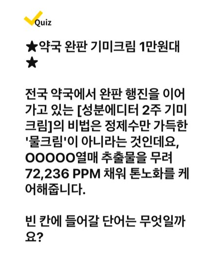 ✅ ★약국 완판 기미크림 1만원대★ 전국 역국에서 완판 행진을 이어가고 있는 [성분에디터 2주 기미크림]의 비법은 정제수만 가득한 '물크림'이 아니라는 것인데요, OOOOO열매 추출물을 무려 72,236PPM 채워 톤노화를 케어해줍니다. 빈 칸에 들어갈 단어는 무엇일까요?