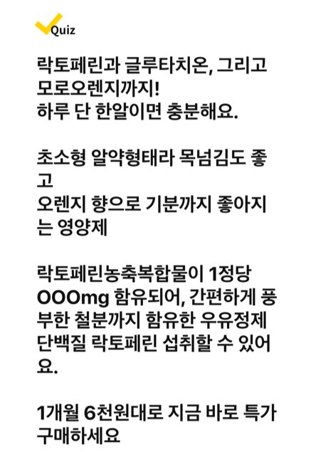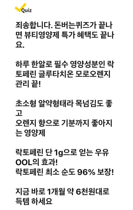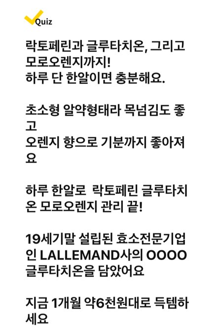 ✅ 죄송합니다. 돈버는 퀴즈가 끝나면 뷰티영양제 특가 혜택도 끝나요. 하루 한알로 필수 영양성분인 락토페린 글루타치온 모로오렌지 관리 긑! 초소형 알약형태라 목넘김도 좋고 오렌지 향으로 기분까지 좋아지는 영양제 락토페린 단 1g으로 얻는 우유 OOL의 효과! 락토페린 최소 순도 96% 보장! 지금 바로 1개월 약 6천원대로 득템하세요