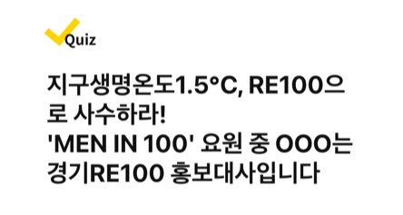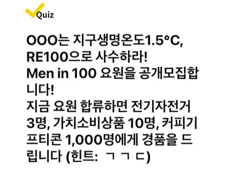 ✅OOO는 지구생명온도 1.5˚C, RE100으로 사수하라! Men in 100 요원을 공개모집합니다! 지금 요원 합류하면 전기자전거 3명, 가치소비상품 10명, 커피 기프티콘 1,000명에게 경품을 드립니다. (힌트 : ㄱㄱㄷ)