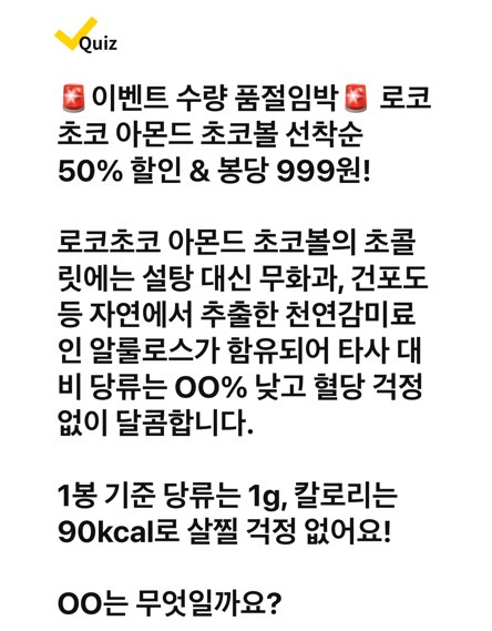 ✅ 🚨이벤트 수량 품절임박🚨로코초코 아몬드 초코볼 선착순 50% 할인&봉당 999원! 로코초코 아몬드 초코볼의 초콜릿에는 설탕 대신 무화과, 건포도 등 자연에서 추출한 천연감미료인 알룰로스가 함유되어 타사 대비 당류는 OO% 낮고 혈당 걱정없이 달톰합니다. 1봉 기준 당류는 1g, 칼로리는 90kcal로 살찔 걱정 없어요! OO는 무엇일까요?