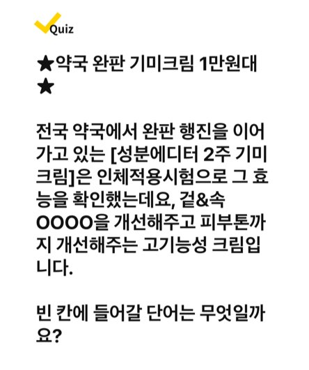 ✅ ★약국 완판 기미크림 1만원대★ 전국 약국에서 완판 행진을 이어가고 있는 [성분에디터 2주 기미크림]은 인체적용시험으로 그 효능을 확인했는데요, 겉&속 OOOO을 개선해주고 피부톤까지 개선해주는 고기능성 크림입니다. 빈 칸에 들어갈 단어는 무엇일까요?