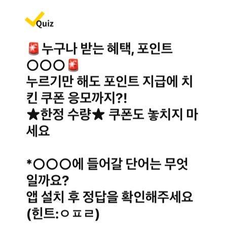 ✅ 🚨누구나 받는 혜택, 포인트 OOO🚨 누르기만 해도 포인트 지급에 치킨 쿠폰 응모까지?! ★한정 수량★ 쿠폰도 놓치지 마세요 *OOO에 들어갈 단어는 무엇일까요? (힌트: ㅇㅍㄹ)