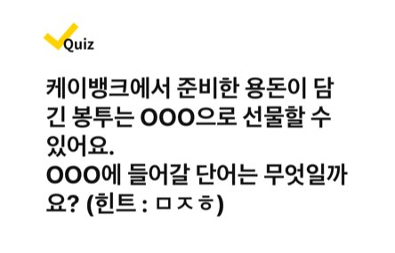 ✅ 케이뱅크에서 준비한 용돈이 담긴 봉투는 OOO으로 선물할 수 있어요. OOO에 들어갈 단어는 무엇일까요? (힌트 : ㅁㅈㅎ)