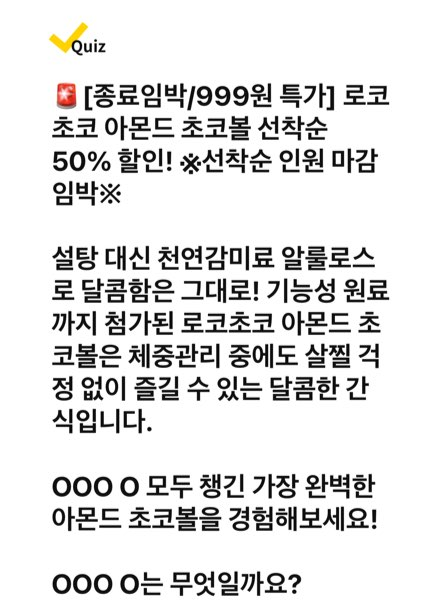 ✅ 🚨[종료임박/999원 특가] 로코초코 아몬드 초코볼 선착순 50% 할인! ※선착순 인원 마감 임박※ 설탕 대신 천연감미료 알룰로스로 달콤함은 그대로! 기능성 원료까지 첨가된 로코초코 아몬드 초코볼은 체중관리 중에도 살찔 걱정 없이 즐길 수 있는 달콤한 간식입니다. OOOO 모두 챙긴 가장 완벽한 아몬드 초코볼을 경험해보세요! OOOO는 무엇일까요?