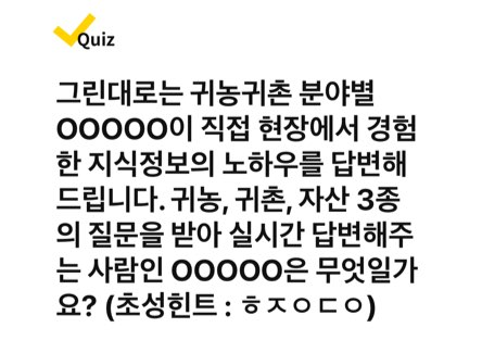 ✅ 그린대로는 귀농귀촌 분야별 OOOOO이 직접 현장에서 경험한 지식정보의 노하우를 답변해드립니다. 귀농, 귀촌, 자산 3종의 질문을 받아 실시간 답변해주는 사람인 OOOOO은 무엇일까요? (초성힌트 : ㅎㅈㅇㄷㅇ)