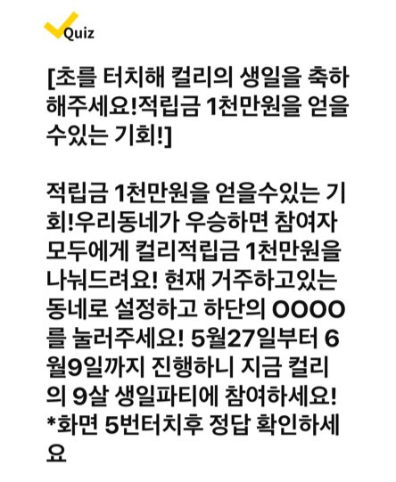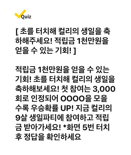 [초를 터치해 컬리의 생일을 축하해주세요! 적립금 1천만원을 얻을 수 있는 기회!] 적립금 1천만원을 얻을 수 있는 기회! 초를 터치해 컬리의 생일을 축하해보세요! 전국 1위 동네 상금 1천만원과 함께 OOO 1위 상금 1만원도 제공합니다! 지금 컬리의 9살 생일파티에 참여하고 적립금 받아가세요!