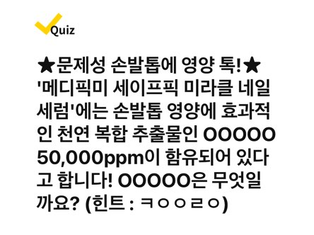 ★문제성 손발톱에 영양 톡!★ '메디픽미 세이프픽 미라클 네일세럼'에는 손발톱 영양에 효과적인 천연 복합 추출물인 OOOOO 50,000ppm이 함유되어 있다고 합니다! OOOOOO은 무엇일까요? (힌트 : ㅋㅇㅇㄹㅇ)
