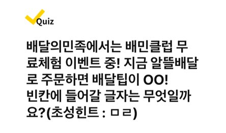 배달의민족에서는 배민클럽 무료체험 이벤트 중! 지금 알뜰배달로 주문하면 배달팁이 OO! 빈칸에 들어갈 글자는 무엇일까요? (초성힌트 : ㅁㄹ)
