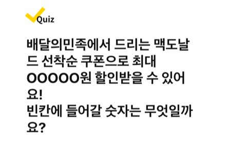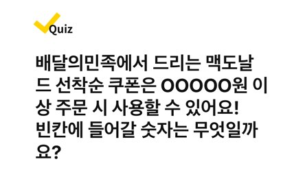 배달의민족에서 드리는 맥도날드 선착순 쿠폰은 OOOOO원 이상 주문 시 사용할 수 있어요! 빈칸에 들어갈 숫자는 무엇일까요?