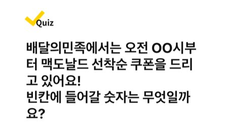 배달의민족에서는 오전 OO시부터 맥도날드 선착순 쿠폰을 드리고 있어요! 빈칸에 들어갈 숫자는 무엇일까요?