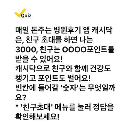✅ 매일 돈주는 병원후기 앱 캐시닥은, 친구 초대를 하면 나는 3000, 친구는 OOO포인트를 받을 수 있어요! 캐시닥으로 친구와 함께 건강도 챙기고 포인트도 벌어요! 빈칸에 들어갈 숫자는 무엇일까요?