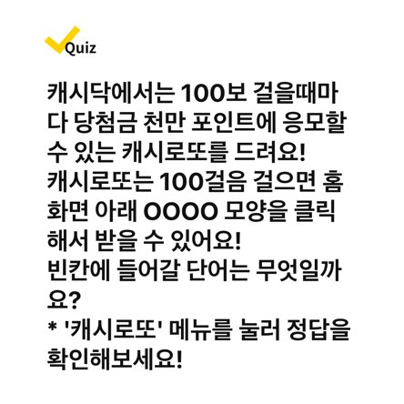 ✅ 캐시닥에서는 100보 걸을때마다 당첨금 천만 포인트에 응모할 수 있는 캐시로또를 드려요! 캐시로또는 100걸음 걸으면 홈 화면 아래 OOOO 모양을 클릭해서 받을 수 있어요! 빈칸에 들어갈 단어는 무엇일까요?