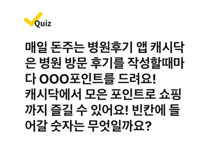✅ 매일 돈주는 병원후기 앱 캐시닥은 병원 방문 후기를 작성할때마다 OOO 포인트를 드려요! 캐시닥에서 모은 포인트로 쇼핑까지 즐길 수 있어요! 빈칸에 들어갈 숫자는 무엇일까요?