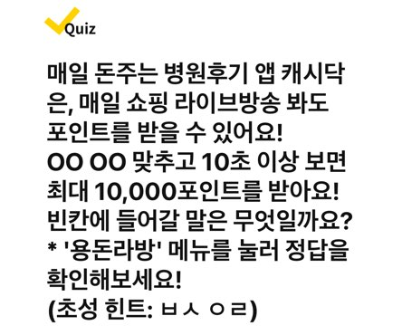 ✅ 매일 돈주는 병원후기 앱 캐시닥은, 매일 쇼핑 라이브방송 봐도 포인트를 받을 수 있어요! OOOO 맞추고 10초 이상 보면 최대 10,000포인트를 받아요! 빈칸에 들어갈 말은 무엇일까요? (초성힌트 : ㅂㅅㅇㄹ)