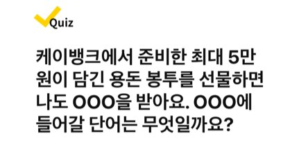 ✅ 케이뱅크에서 준비한 최대 5만원이 담긴 용돈봉투를 선물하면 나도 OOO을 받아요. OOO에 들어갈 단어는 무엇일까요?