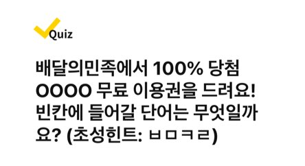 ✅ 배달의민족에서 100% 당첨 OOOO 무료 이용권을 드려요! 빈칸에 들어갈 단어는 무엇일까요? (초성힌트 : ㅂㅁㅋㄹ)