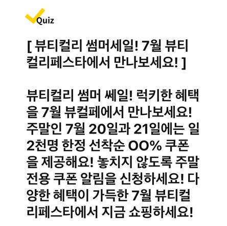✅ [뷰티컬리 썸머세일! 7월 뷰티컬리페스타에서 만나보세요!] 뷰티컬리 썸머 쎄일! 럭키한 혜택을 7월 뷰컬페에서 만나보세요! 뷰컬페 쿠폰과 든든한 쇼핑 지원 혜택 모두 챙겨가세요! 매일 한정수량 77개의 행운이 제공되는 OOO까지! 매일 오전 11시에 오픈하니 놓치지 말고 꼭 담아가세요! 지금 7월 뷰티컬리페스타에서 쇼핑하세요! (힌트 : ㄹㅋㄷ)