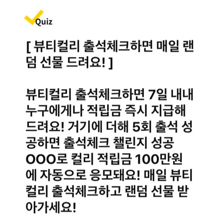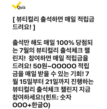 ✅ [뷰티컬리 출석하면 매일 적립금 드려요!] 출석만 해도 매일 100% 당첨되는 7월의 뷰티컬리 출석체크 챌린지! 참여하면 매일 적립금을 드려요! 50원~OOOOO 적립금을 매일 받을 수 있는 기회! 7월 15일부터 21일까지 진행하는 뷰티컬리 출석체크 챌린지 지금 참여하세요! (힌트: 숫자OOO+한글O)