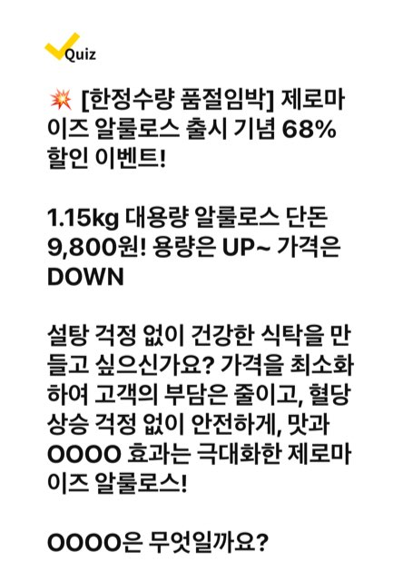 ✅ [1차 수량 완판] 제로마이즈 알룰로스 출시 기념 68% 하인! 2차 이벤트 긴급 물량 확보! 단 3,000병 한정! 1.15kg 대용량 알룰로스가 단돈 9,800원! 제로마이즈 알룰로스는 대용량 1.15kg으로 넉넉하게 사용 가능합니다. 설탕보다 더 맛있고 달콤한데 건강한 대용량 알룰로스로 더욱 OOO으로 즐겨보세요! OOO은 무엇일까요?
