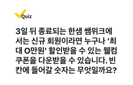✅ 3일 뒤 종료되는 한샘 쌤위크에서는 신규 회원이라면 누구나 '최대 O만원' 할인받을 수 있는 웰컴쿠폰을 다운받을 수 있습니다. 빈칸에 들어갈 숫자는 무엇일까요?