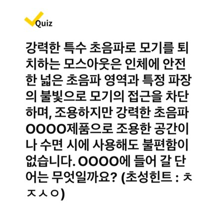 ✅ 강력한 특수 초음파로 모기를 퇴치하는 모스아웃은 인체에 안전한 넓은 초음파 영역과 특정 파장의 불빛으로 모기의 접근을 차단하며, 조용하지만 강력한 초음파 OOOO제품으로 조용한 공간이 나 수면 시에 사용해도 불편함이 없습니다. OOOO에 들어갈 단어는 무엇일까요? (초성힌트 : ㅊㅈㅅㅇ)
