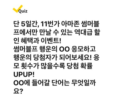 ✅ 단 5일간, 11번가 아마존 썸머블프에서만 만날 수 있는 역대급 할인 혜택과 이벤트! 썸머블프 행운의 OO 응모하고 행운의 당첨자가 되어보세요! 응모 횟수가 많을수록 당첨 확률 UPUP! OO에 들어갈 단어는 무엇일까요?