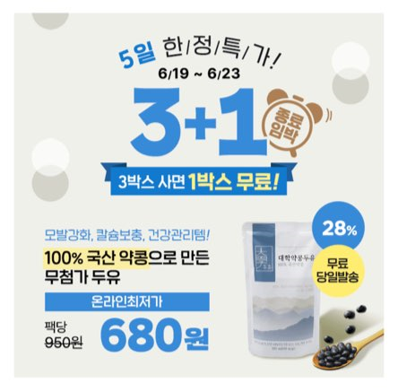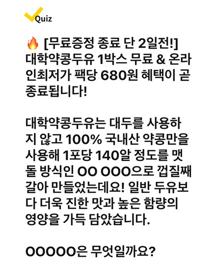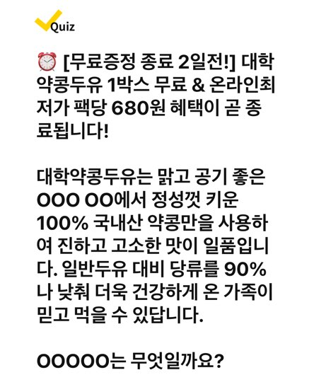 ✅ [무료증정 종료 2일전!] 대학 약콩두유 1박스 무료&온라인 최저가 팩당 680원 혜택이 곧 종료됩니다! 대학약콩두유는 맑고 공기 좋은 OOOOO에서 정성껏 키운 100% 국내산 약콩만을 사용하여 진하고 고소한 맛이 일품입니다. 일반두유 대비 당류 90%나 낮춰 더욱 건강하게 온 가족이 믿고 먹을 수 있답니다. OOOOO는 무엇일까요?