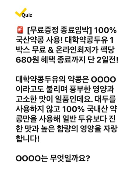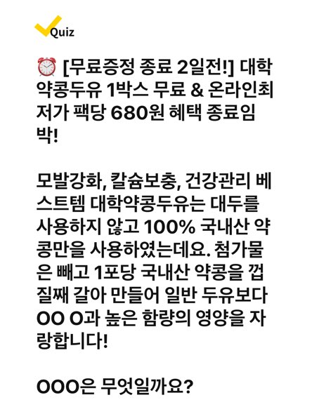 ✅ [무료증정 종료임박] 100% 국산약콩 사용! 대학약콩두유 1박스 무료 & 온라인최저가 팩당 680원 혜택 종료까지 단 2일전! 대학약콩두유는 약콩의 영양을 통쨰로! 첨가물 없이 더욱 건강하게 만들어 OOOO 그대로 섭취할 수 있습니다. 일반두유보다 당류는 90% 낮추고 100% 국산 약콩을 껍질째 그대로 달아 만들었어요! OOOO은 무엇일까요?