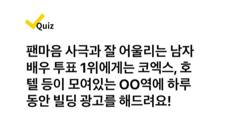 ✅ 팬마음 사극과 잘 어울리는 남자배우 투표 1위에게는 코엑스, 호텔 등이 모여있는 OO역에 하루 동안 빌딩 광고를 해드려요!