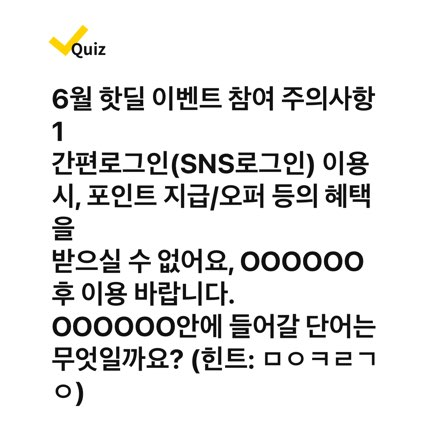 ✅ 6월 핫딜 이벤트 참여 주의사항1 간편로그인(SNS로그인)이용 시, 포인트 지급/오퍼 등의 혜택을 받으실 수 없어요, OOOOOO 후 이용 바랍니다. OOOOOO안에 들어갈 단어는 무엇일까요? ( 힌트 : ㅁㅇㅋㄹㄱㅇ)