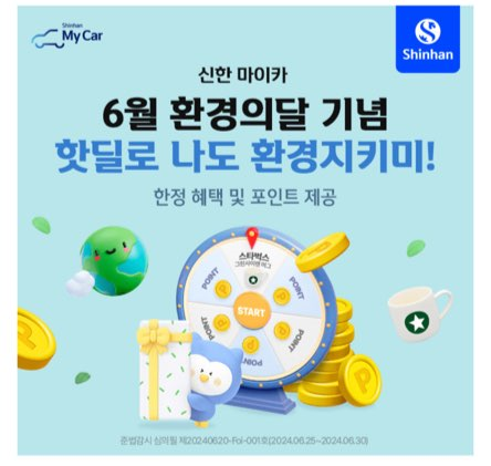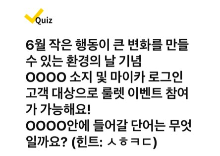 ✅ 6월 작은 행동이 큰 변화를 만들 수 있는 환경의 날 기념 OOOO 소지 및 마이카 로그인 고객 대상으로 룰렛 이벤트 참여가 가능해요! OOOO안에 들어갈 단어는 무엇일까요? (힌트 : ㅅㅎㅋㄷ)