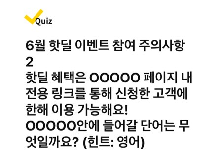 ✅ 6월 핫딜 이벤트 참여 주의사항2 핫딜 혜택은 OOOOO 페이지 내 전용 링크를 통해 신청한 고객에 한해 이용 가능해요! OOOOO안에 들어갈 단어는 무엇일까요? (힌트 : 영어 )