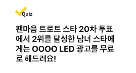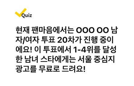 ✅ 현재 팬마음에서는 OOOOO 남자/여자 투표 20차가 진행중이에요! 이 투표에서 1-4위를 달성한 남녀 스타에게는 서울 중심지 광고를 무료로 드려요!