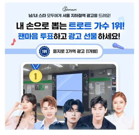 ✅ 팬마음 트로트 스타 20차 투표 1위 스타에게는 다양한 맛집, 청계천이 있는 OOOOO역에 벽면 광고를 30일동안 해드려요!