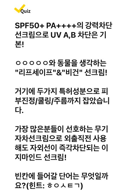 ✅ SPF50+ PA++++의 강력차단 선크림으로 UV A,B 차단은 기본! OOOOO와 동물을 생각하는 "리프세이프"&"비건"선크림! 거기에 두가지 특허성분으로 피부진정/쿨링/주름까지 잡았습니다. 가장 많은분들이 선호하는 무기자차 타입의 선크림으로 외출직전 사용해도 자외선이 즉각차단되는 이지마인드선크림 빈칸에 들어갈 단어는 무엇일까요? (힌트 : ㅎㅇㅅㅌㄱ)