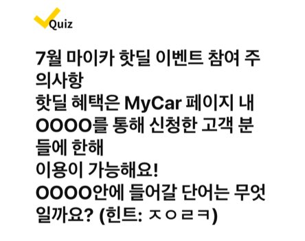 ✅ 추가 미션2 EVENT1 참여 완료 후 내차고i 등록 시 혜택 지급! 내차도 가족의 차도 OOOO만 넣고 쑝~! 10초만에 OOOO로 차량 등록하고 미션2 클리어 해보세요 OOOO안에 들어갈 단어는 무엇일까요? (힌트 : ㅊㄹㅂㅎ)