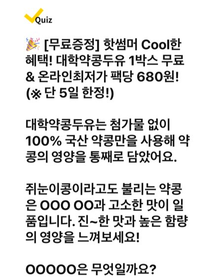 ✅ 🎇 [무료증정] 핫썸머 Cool한 혜택! 대학약콩두유 1박스 무료 & 온라인최저가 팩당 680원! (※ 단 5일 한정!) 고객 찐 리뷰가 증명하는 대학약콩두유! "다이어트중이라 단백질도 필요한데 OOOO 단백질 챙기기로 좋아용" 첨가물 없이 100% 국산 약콩만을 사용한 대학약콩두유로 모발강화, 칼슘보충, 건강관리까지~ OOOO은 무엇일까요?