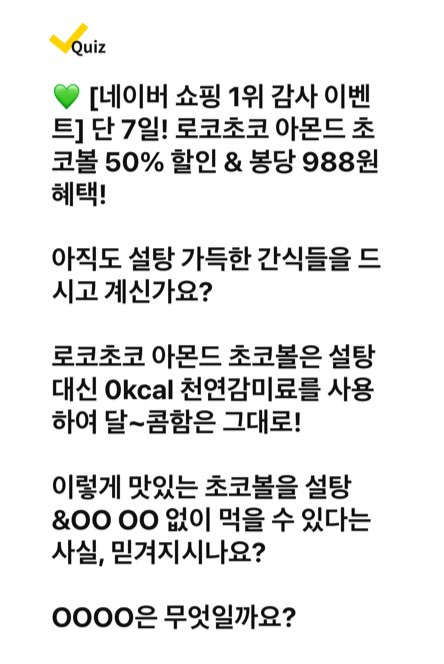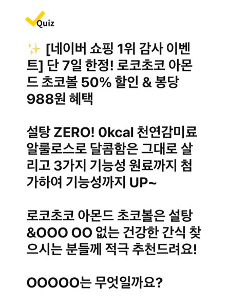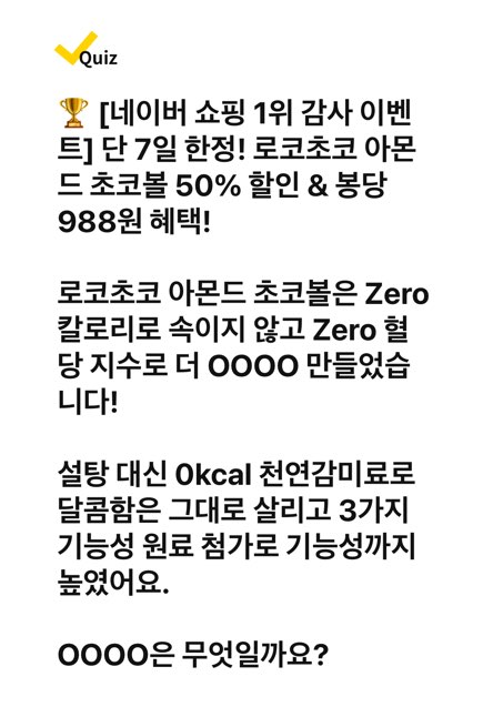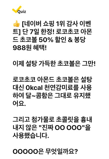 ✅ ✨ [네이버 쇼핑 1위 감사 이벤트] 단 7일 한정! 로코초코 아몬드 초코볼 50% 할인 & 봉당 988원 혜택! 아직도 '무설탕'에 속고 있나요? 설탕 ZERO라고 다 같은 무설탕이 아닙니다! 로코초코 아몬드 초코볼은 합성감미료가 아닌 0kcal 천연감미료로 OOO는 빼고 달콤함은 그대로 유지했어요! 혈당 오를 걱정 없이 달콤하게! OOO은 무엇일까요?
